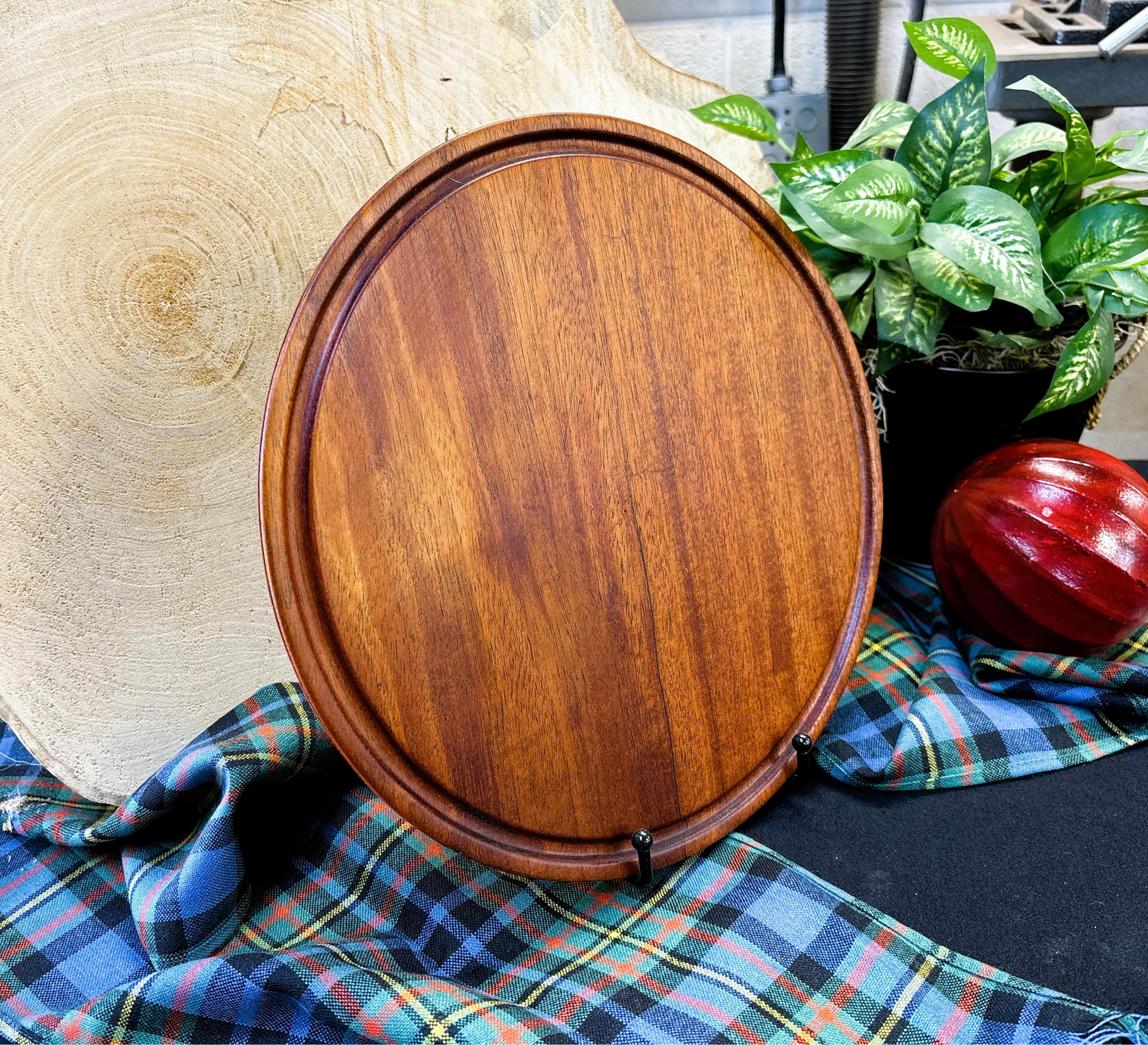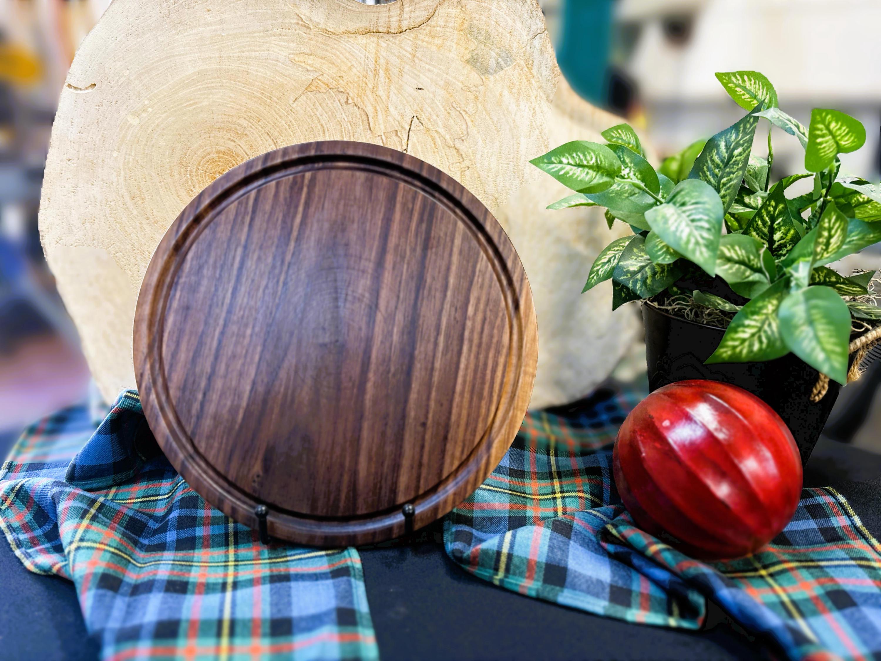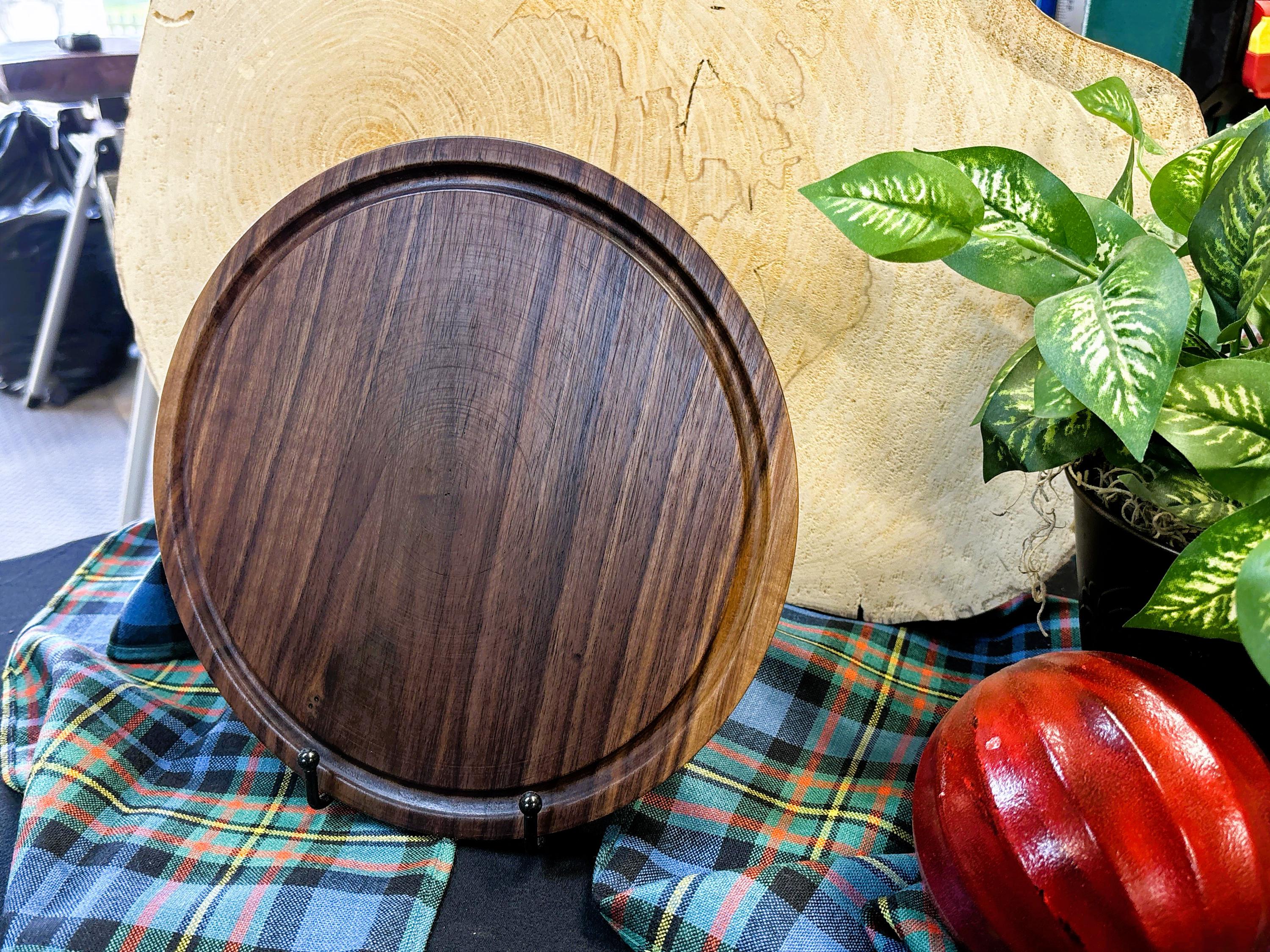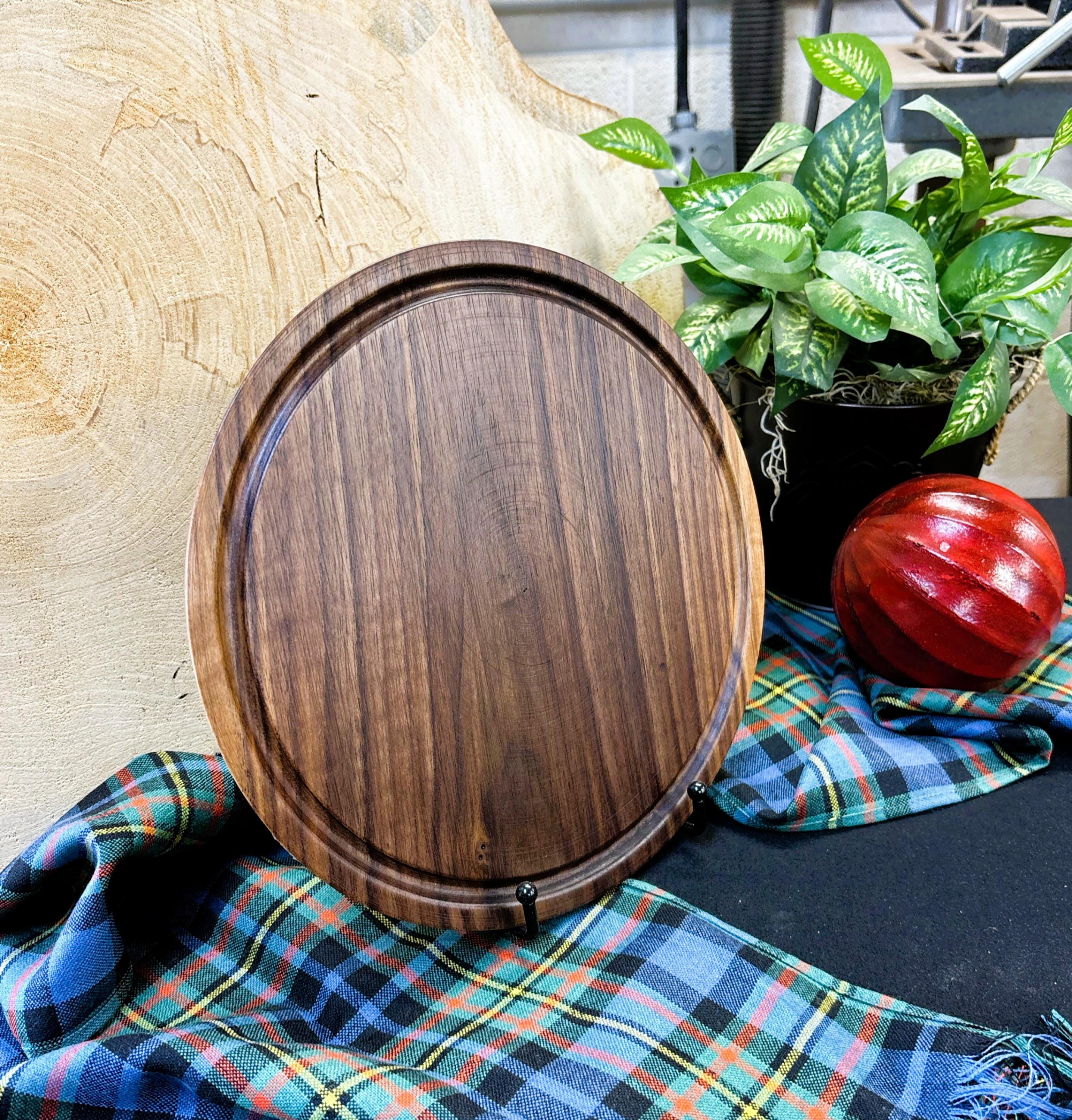 This 11" walnut cutting board is both durable and adds beauty to the kitchen. It is functional and yet, the beauty of the walnut grain will make this board suitable for decorative purposes also. The 11" diameter is large enough to utilized this board for small charcuteries when the occasion demands.