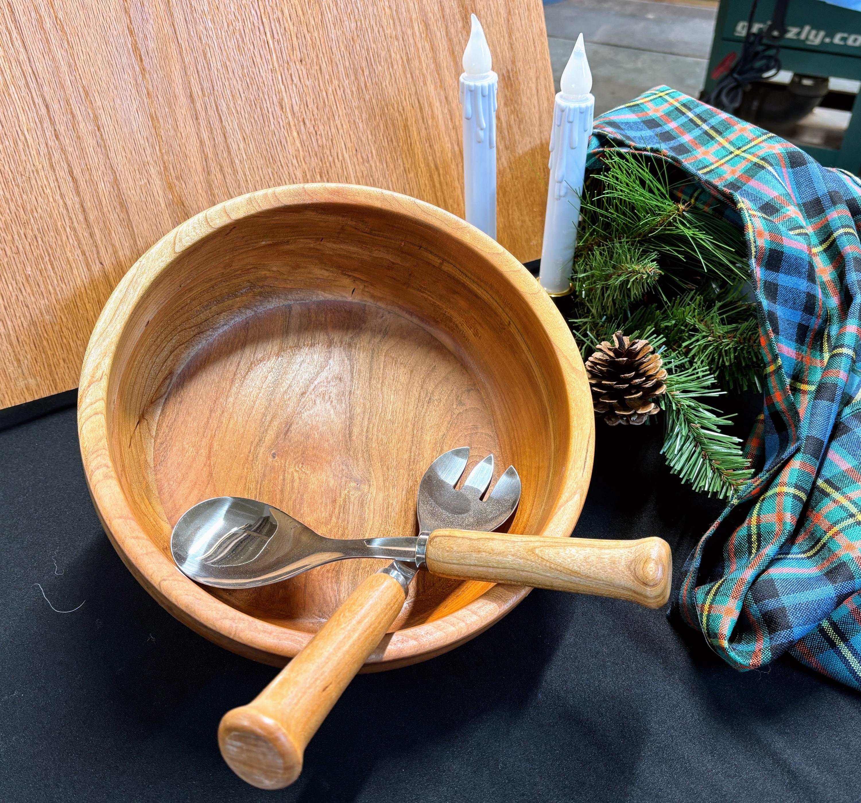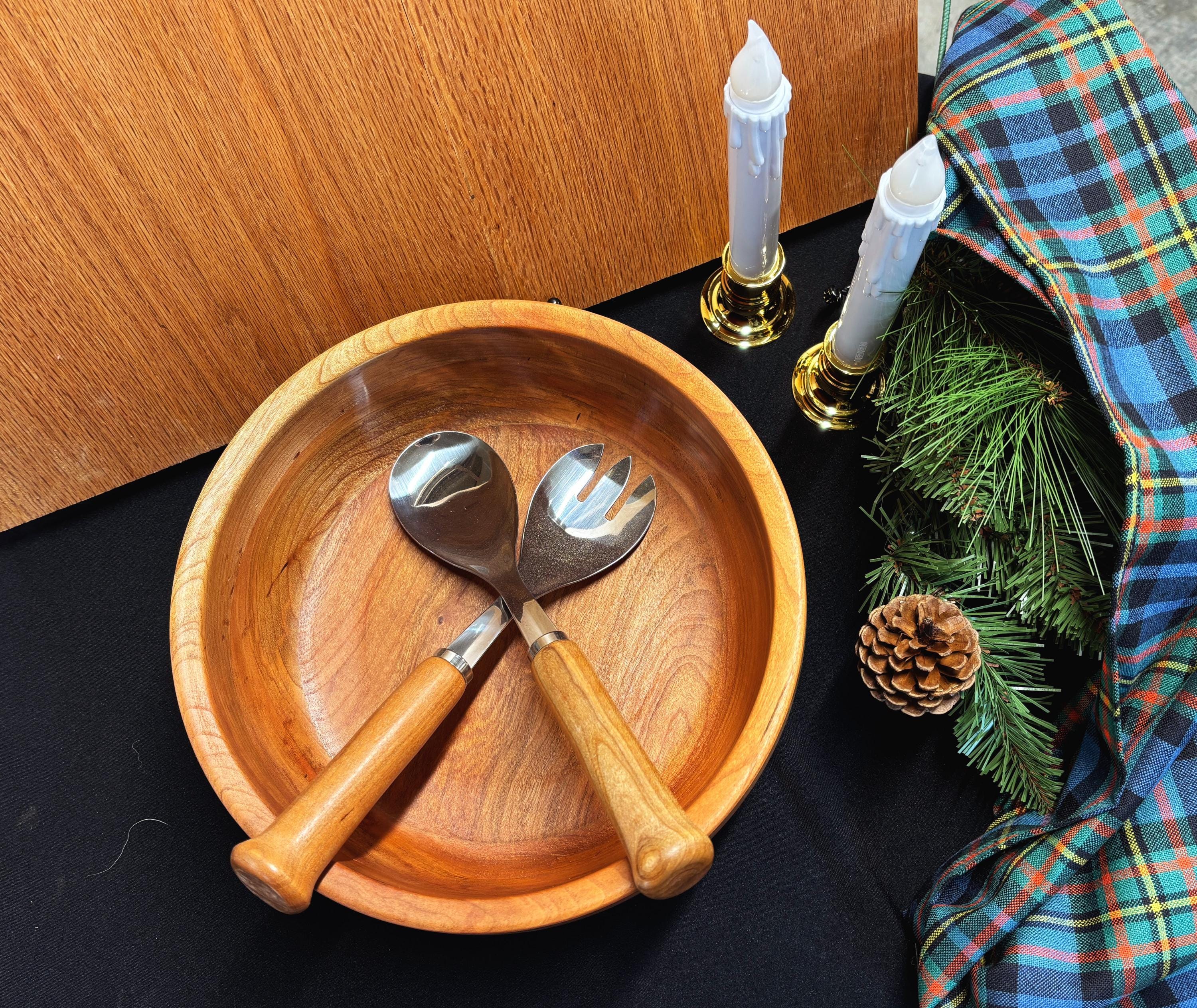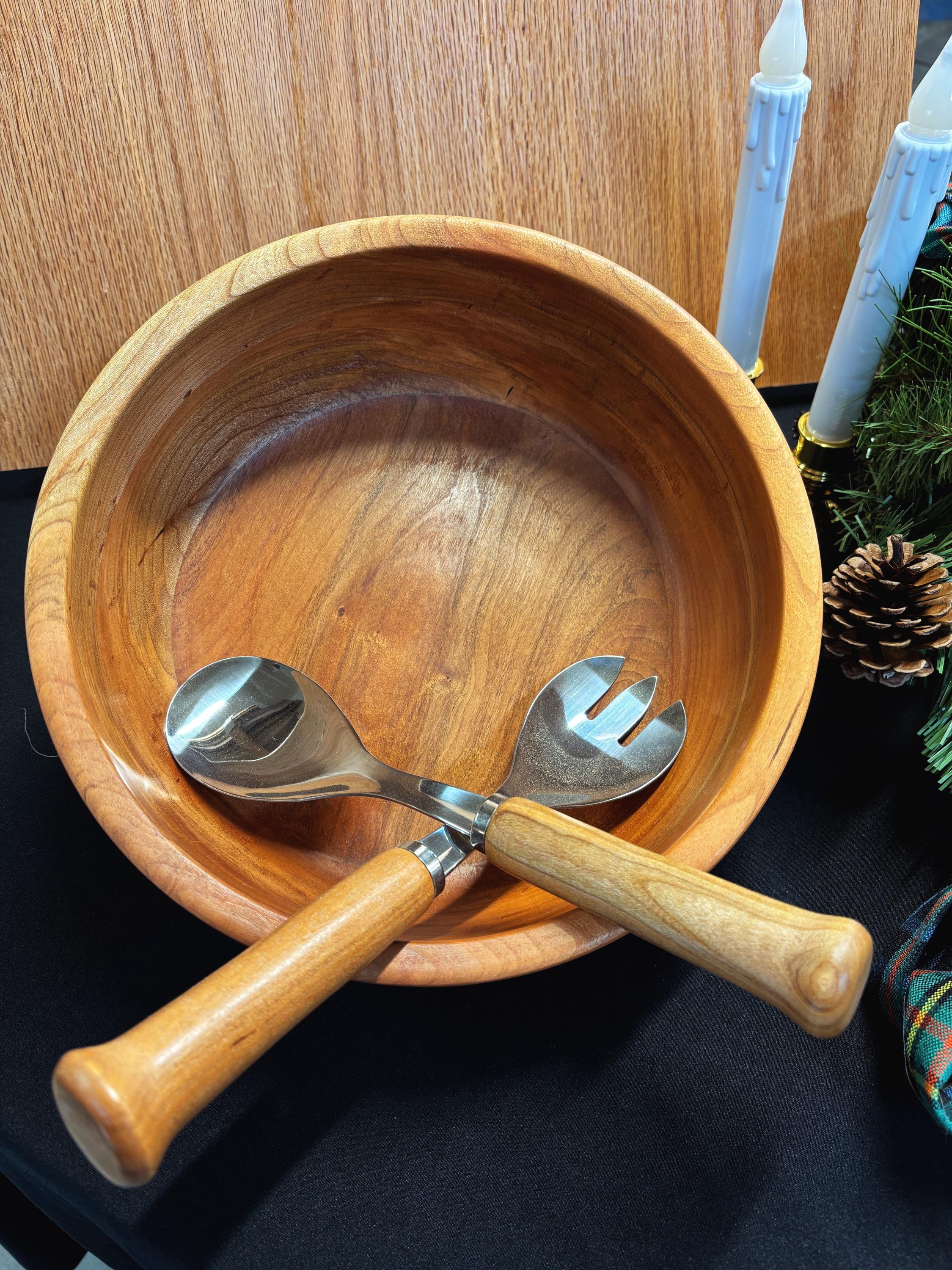 This Cherry wood salad set was created using locally harvested wood (NE Tennessee) that was air-dried for over 10 years. The salad bowl is approximately 11" diameter and 3 1/2" deep.